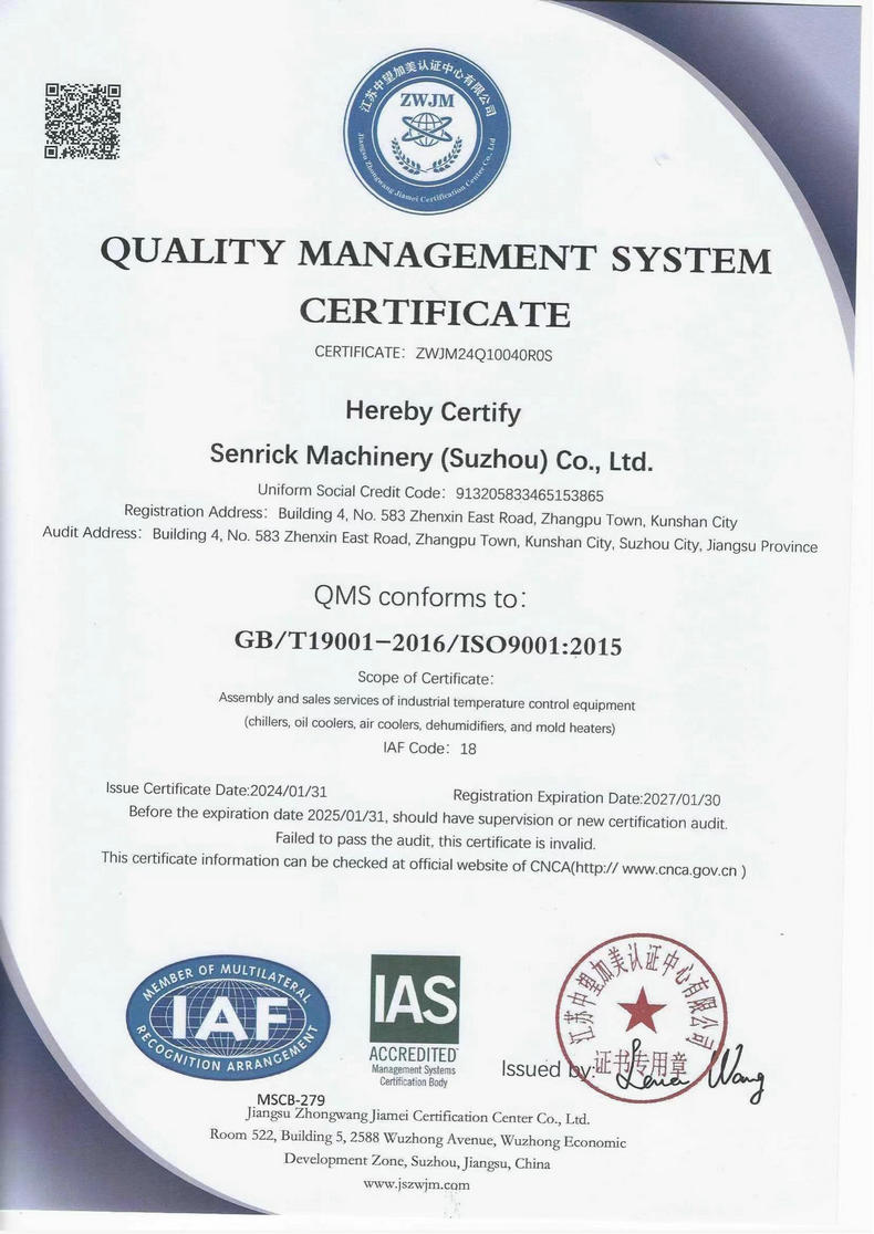 森瑞克機械(蘇州)有限公司(簡稱:SENRICK)是一家中外合作性企業,引進技術,專注于工業制冷設備,工業溫控設備,非標制冷設備,集激光,化工,真空設備輔機等集研發、生產、銷售、服務于一體的的現代化科技企業。公司擁有完善的制造設備,先進的檢測系統,獨立的加工、生產工藝,一支開拓創新專業有素的技術人才團隊,以及全面的質量控制體系,為產品質量的不斷優化提供了強大的保障,以確保滿足不同市場的各種需求。經過多年的努力企業相繼研發生產出了工業冷水機,工業冷風機,工業冷油機,工業機,低溫冷水機,低溫冷風機,低溫冷油機,螺桿式冷水機...